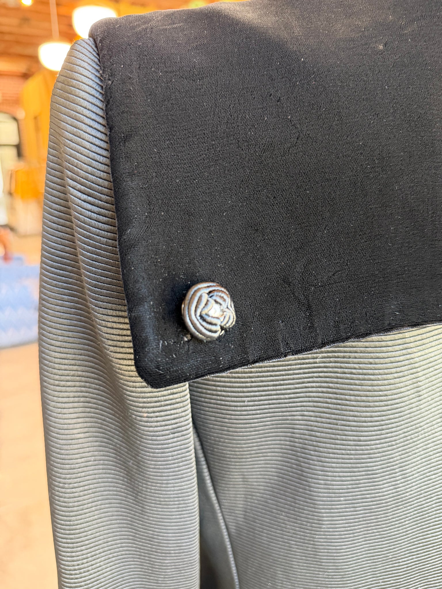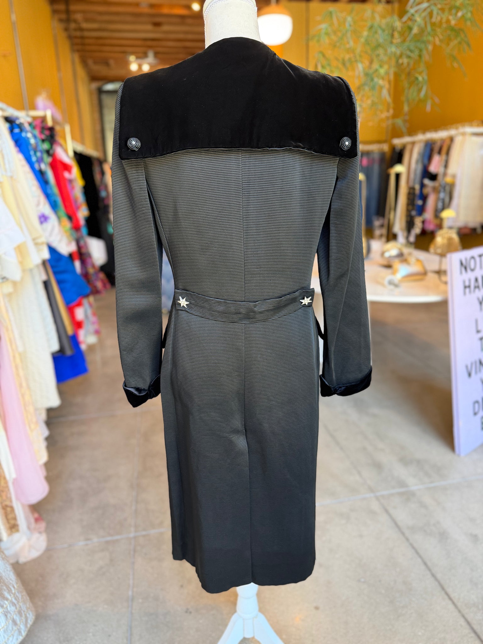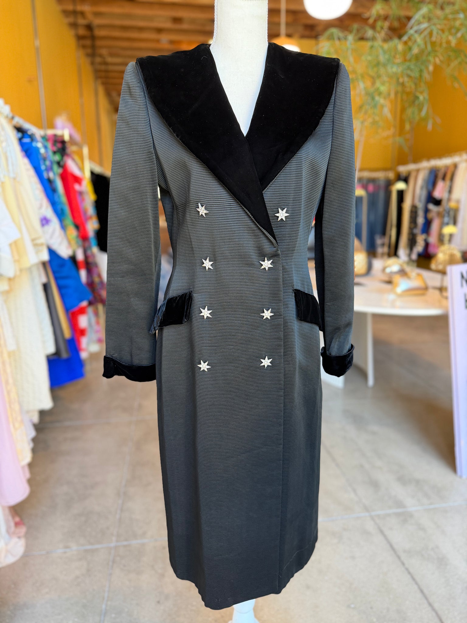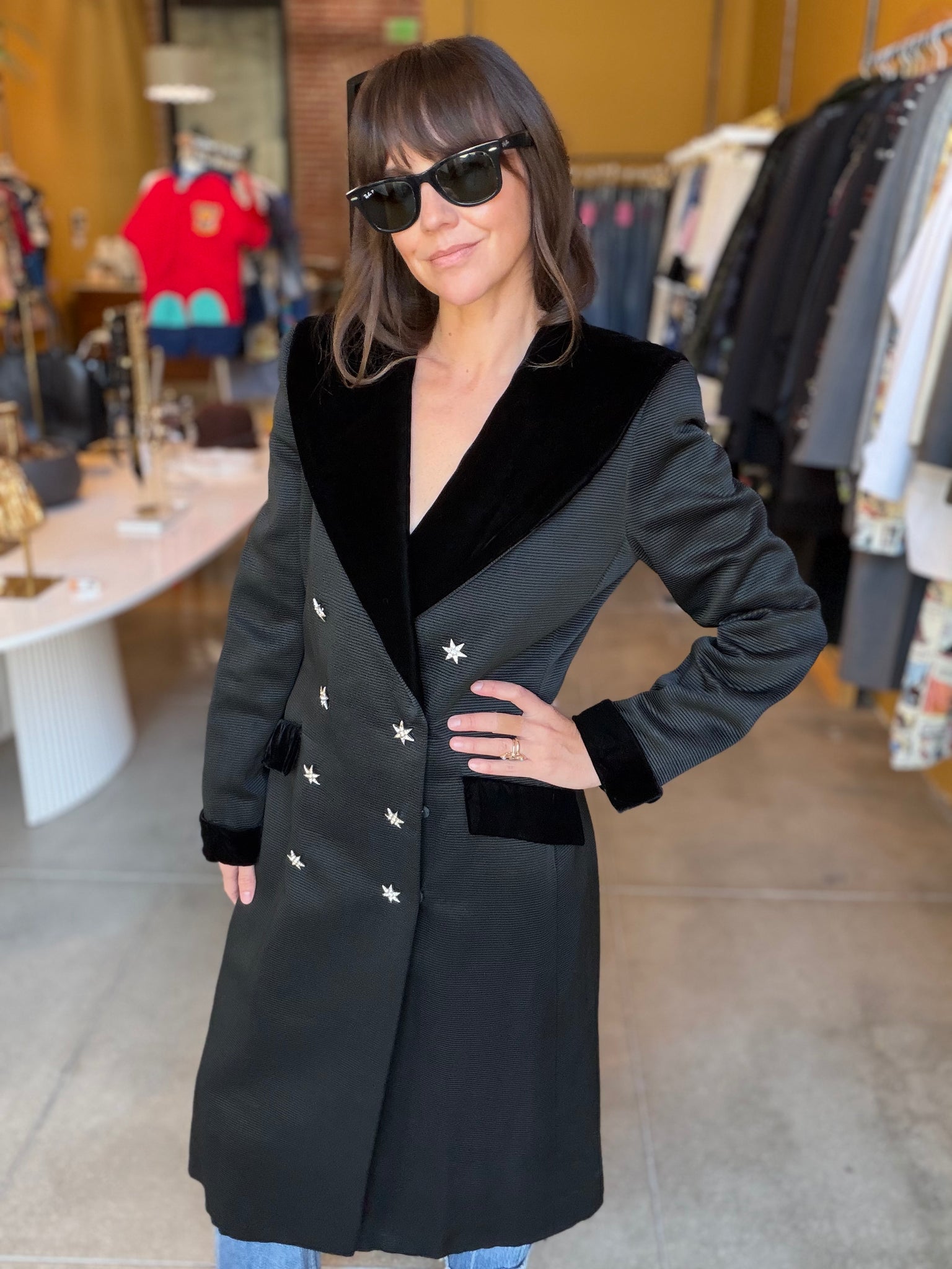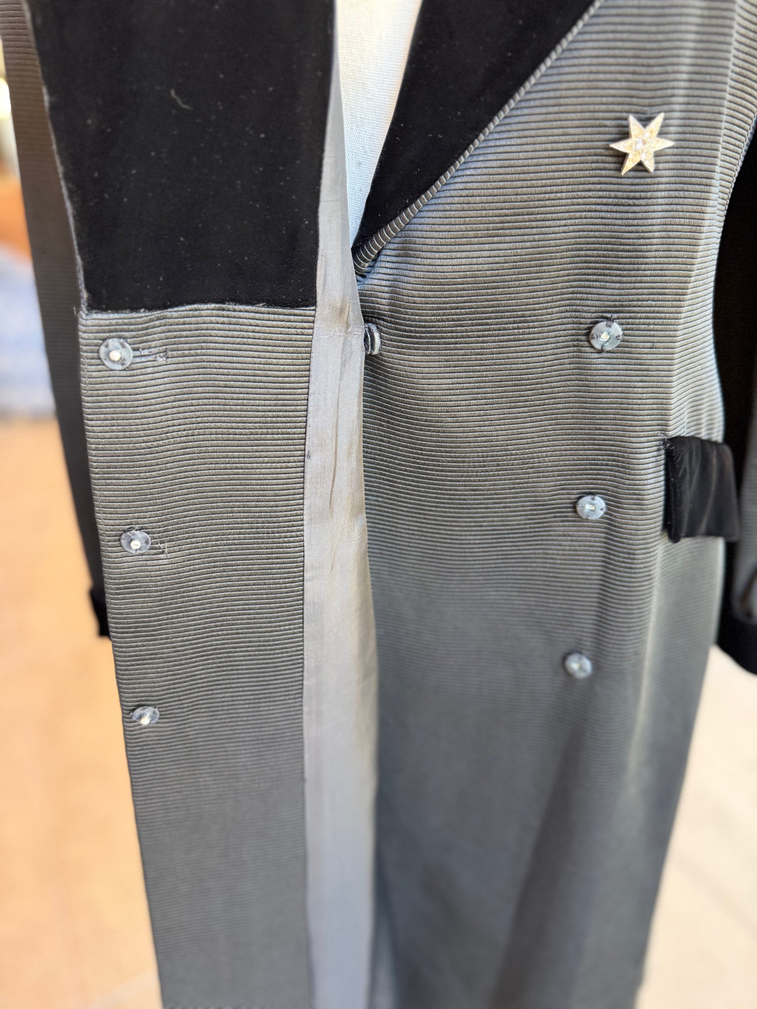 Incredible silk and velvet overcoat with crystal star buttons, union made. Excellent used condition, no flaws.