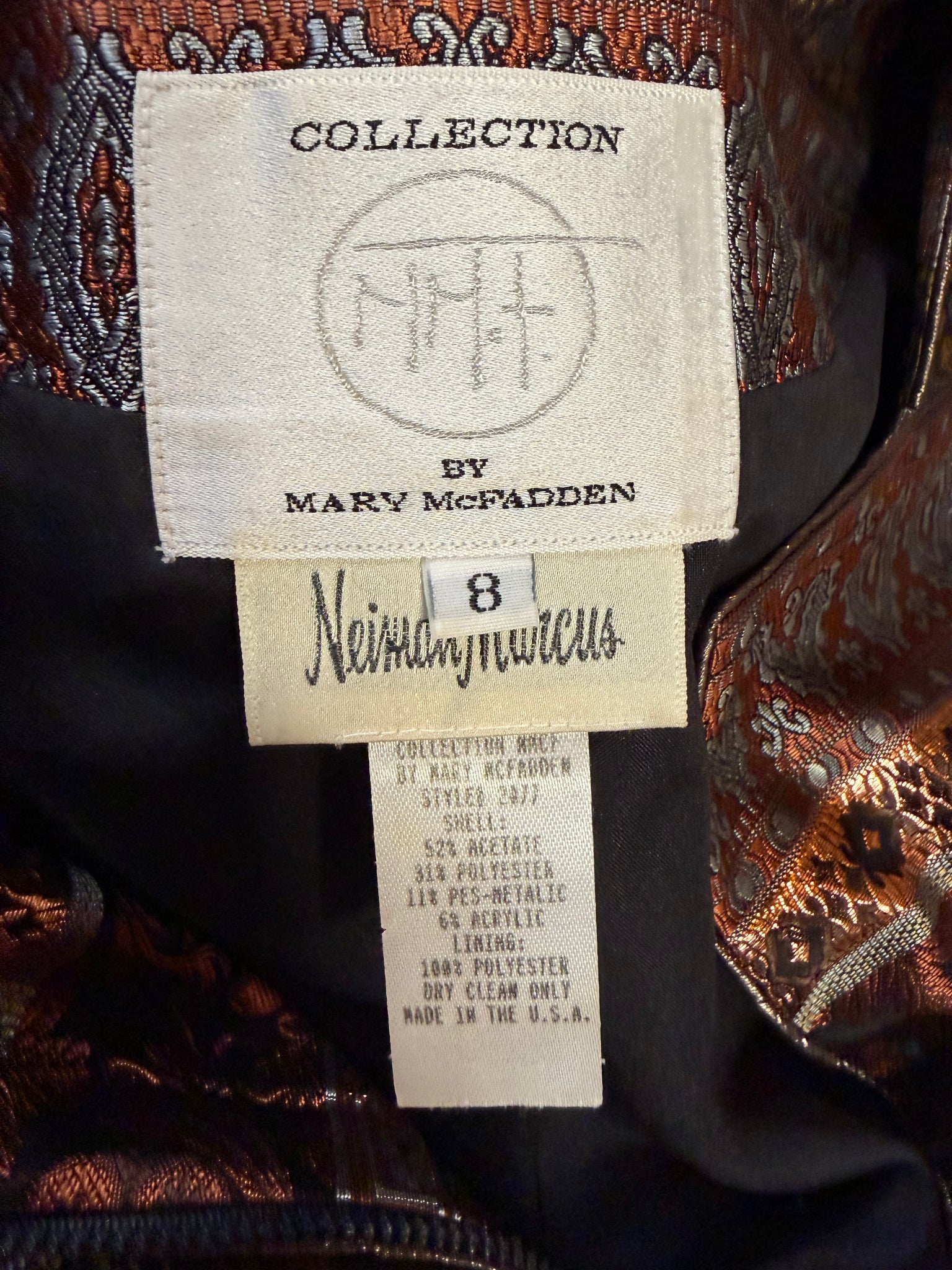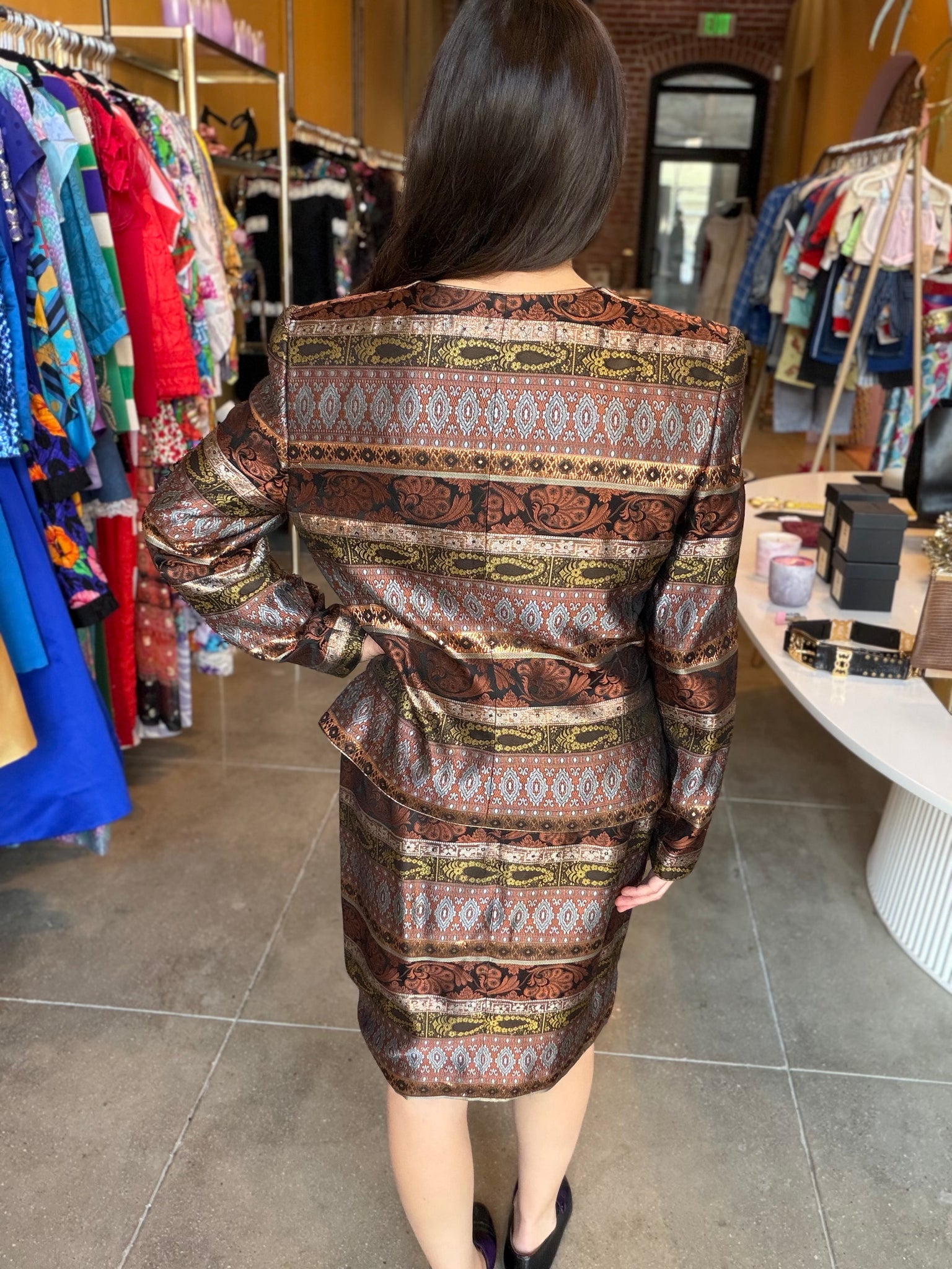 Incredible skirt suit with metallic thread throughout fabric. No flaws. *skirt has been pinned shorter to show how it could look altered. Belt not available.