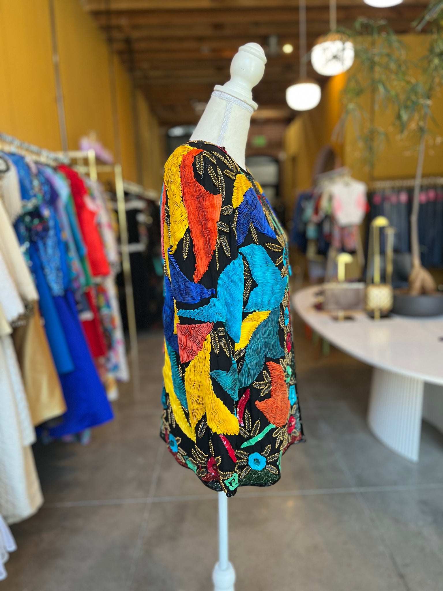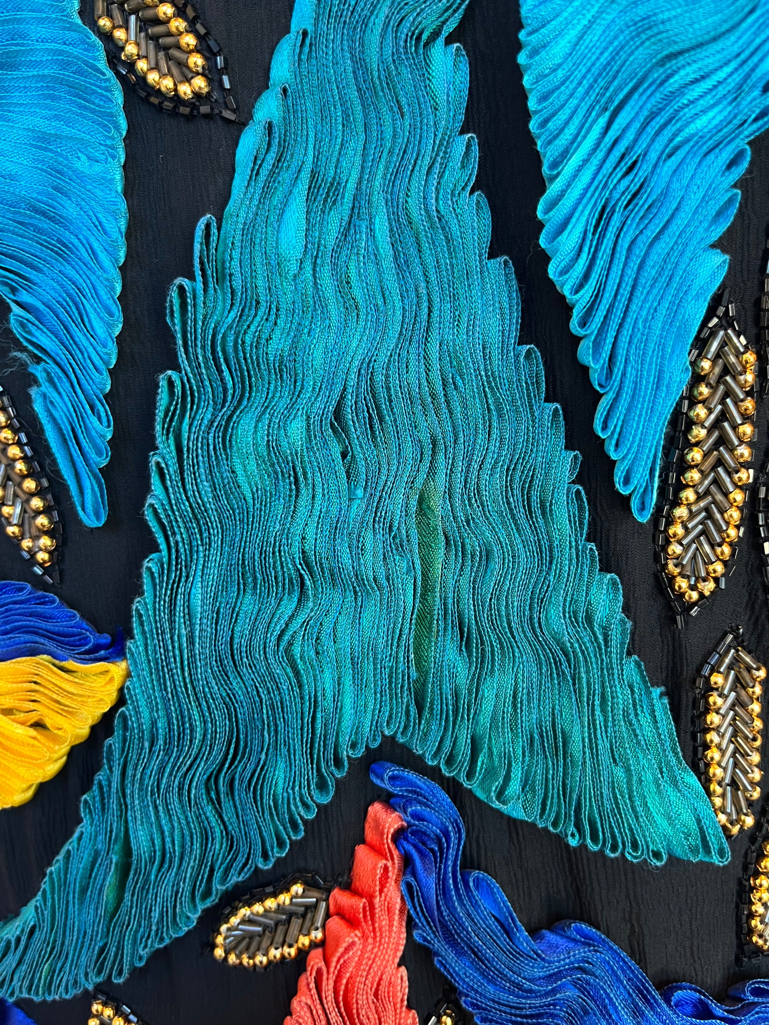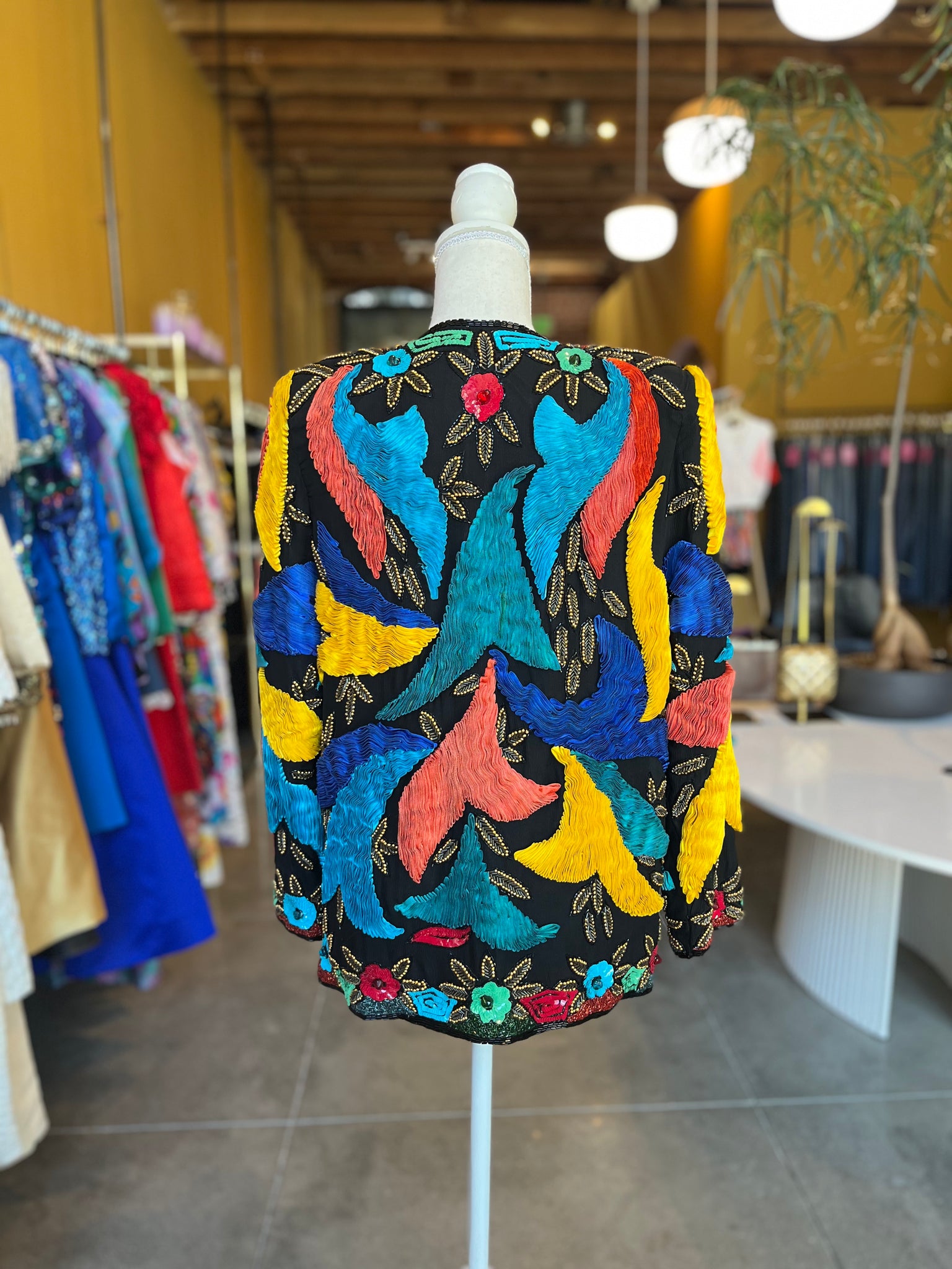 Incredible vintage silk jacket with silk ribbon, glass beads and sequins. Truly a work of art. Great used condition, one flaw on ribbon on back, looks like the glue leaked, shown in pictures. One hook/eye clasp at top and rest of jacket open.