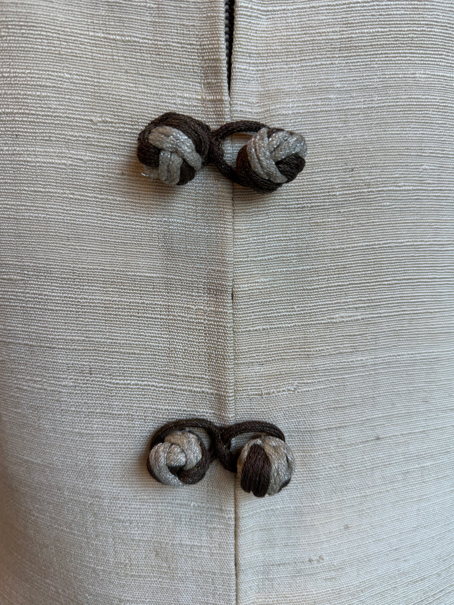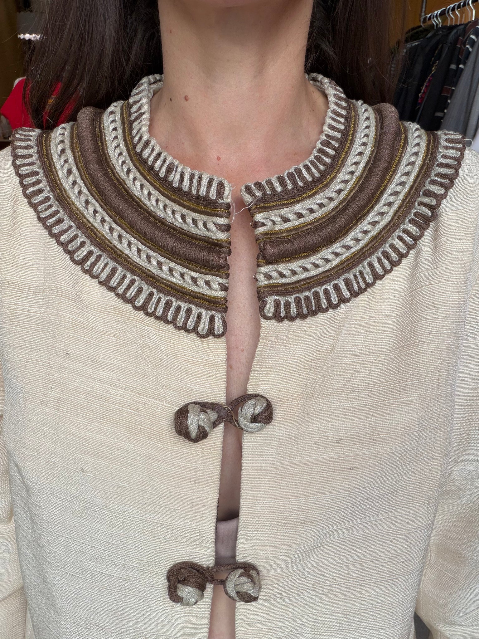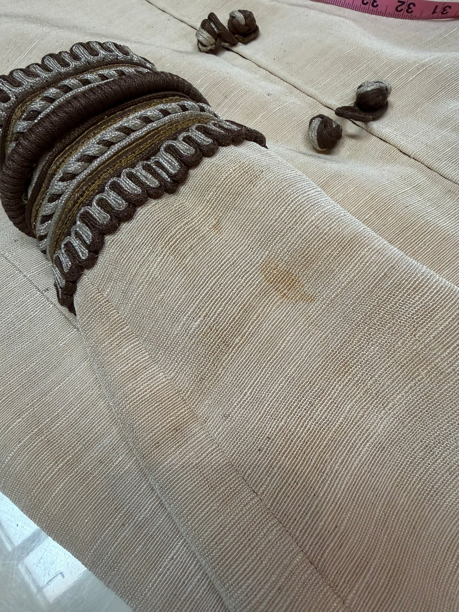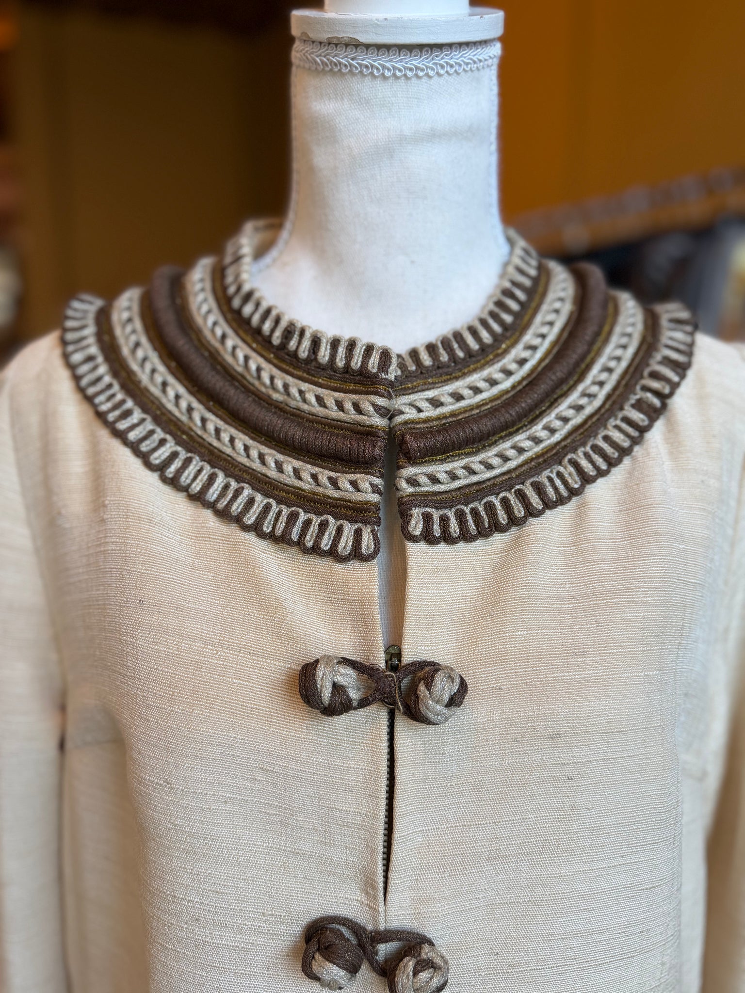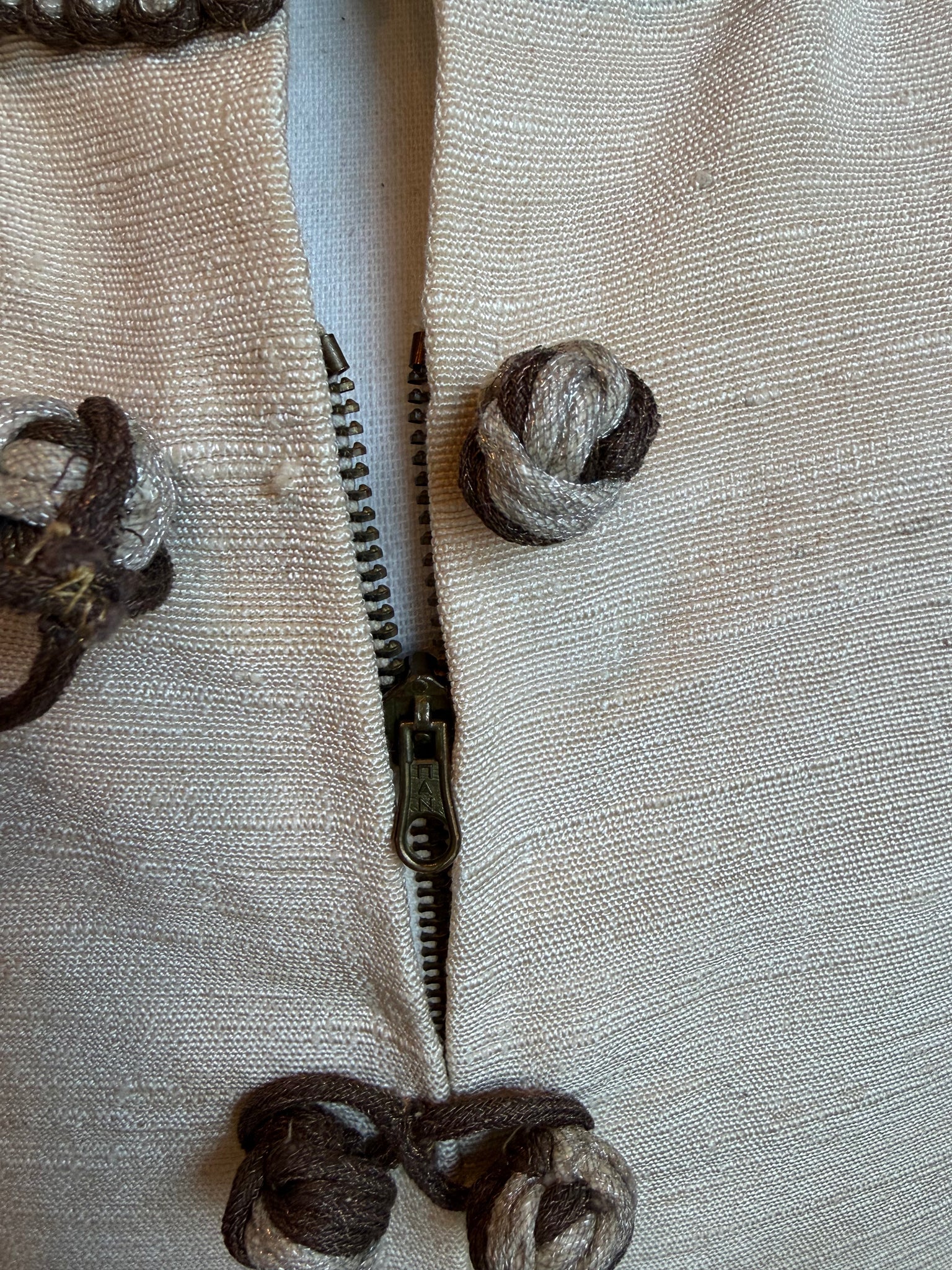 Incredible vintage raw silk duster made in Athens, with chord detail on collar, cuffs and buttons. Zips all the way up, but can be worn open or just with buttons. *One small spot on sleeve, as pictured, otherwise excellent condition. Has been professionally cleaned.