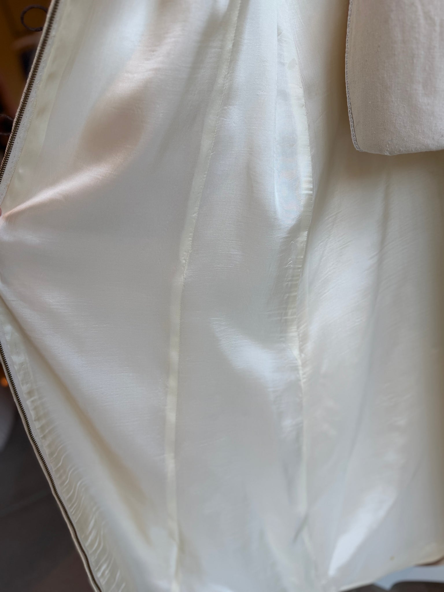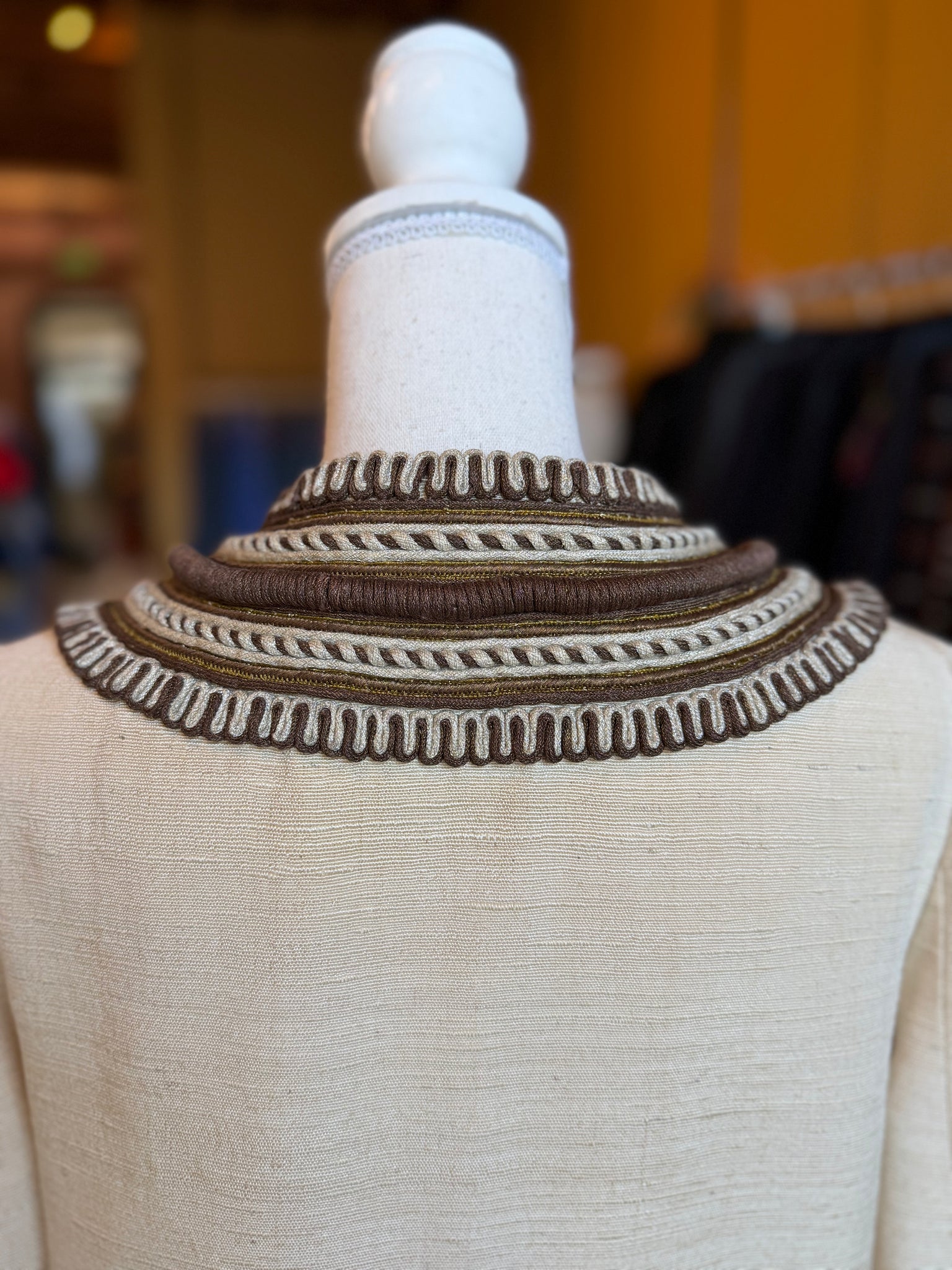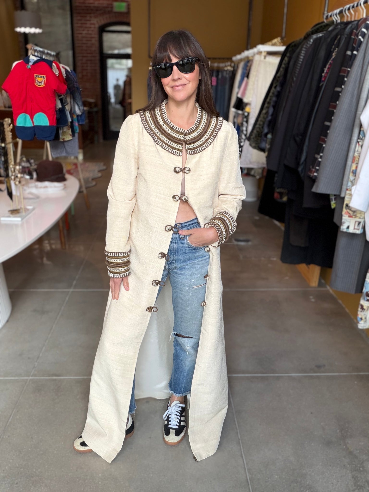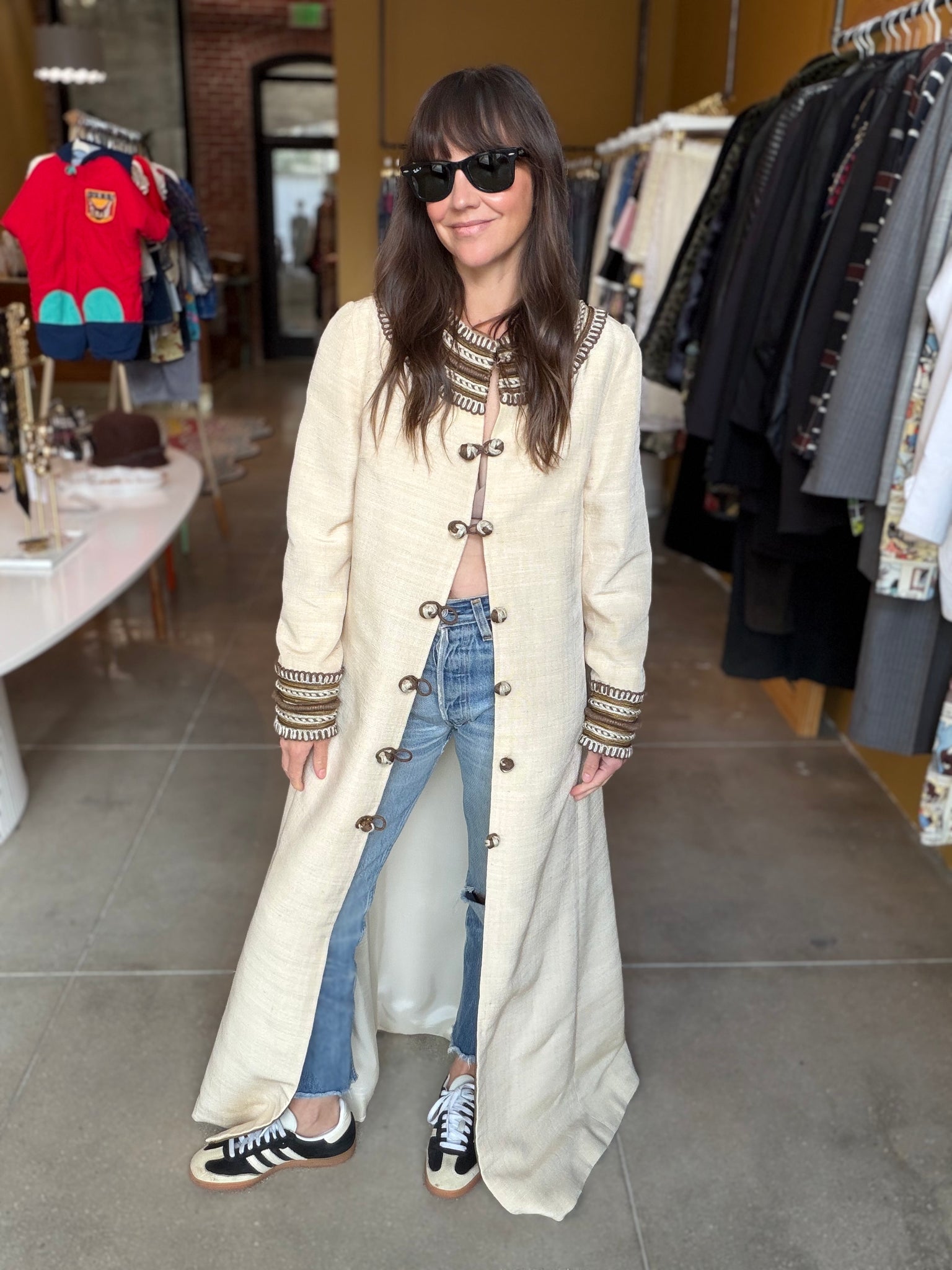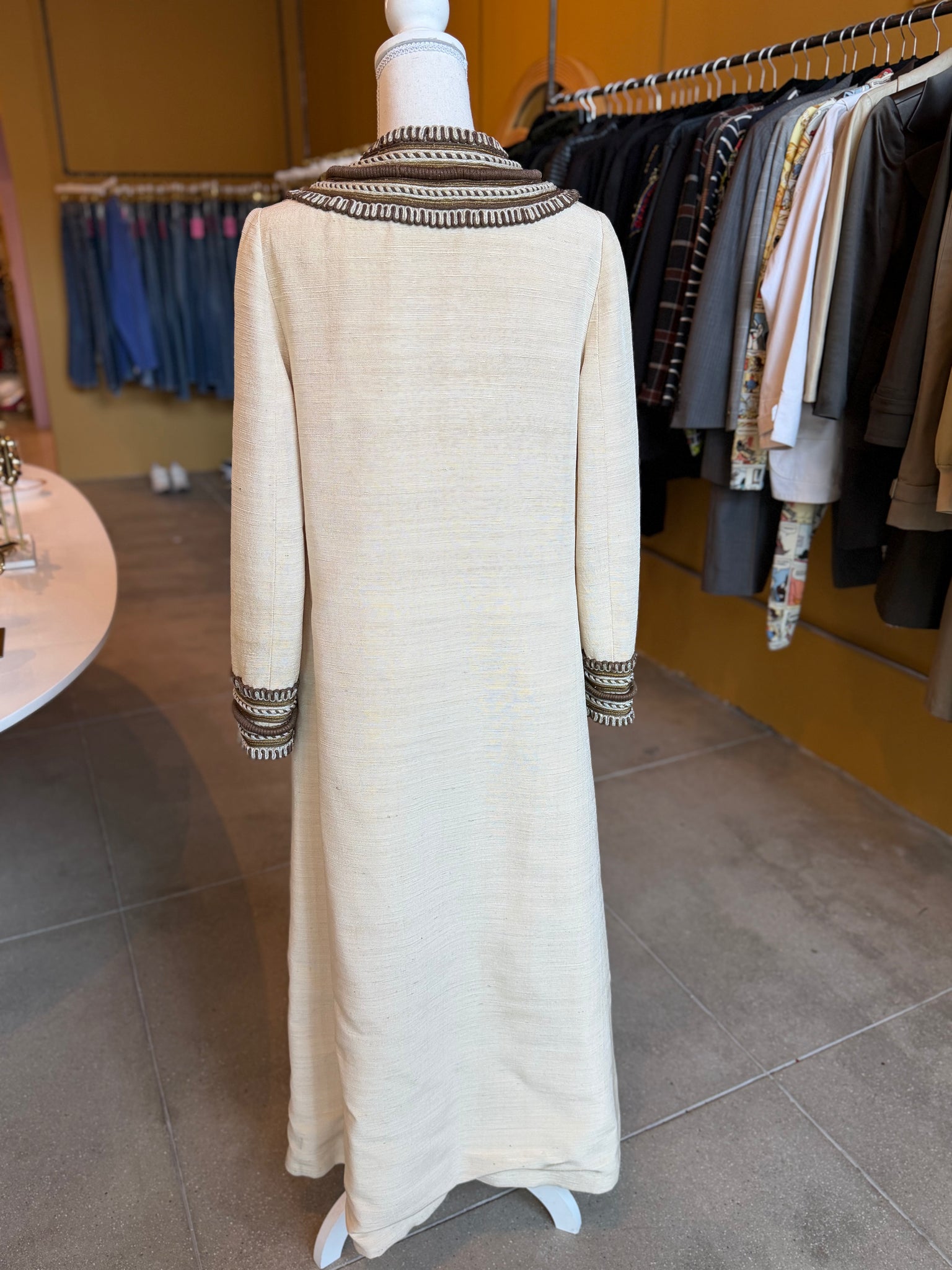 Incredible vintage raw silk duster made in Athens, with chord detail on collar, cuffs and buttons. Zips all the way up, but can be worn open or just with buttons. *One small spot on sleeve, as pictured, otherwise excellent condition. Has been professionally cleaned.