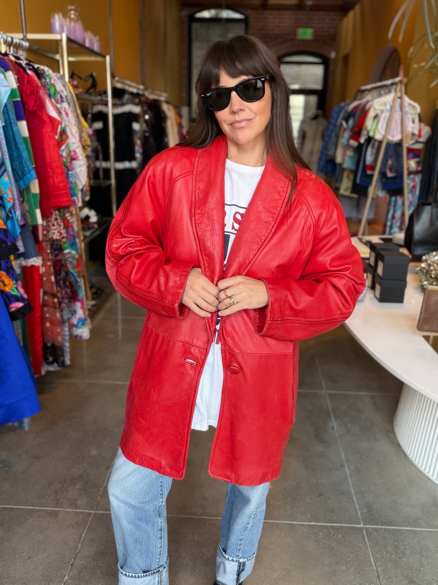 Perfect leather jacket in a pop of red. Great used condition, excellent patina.