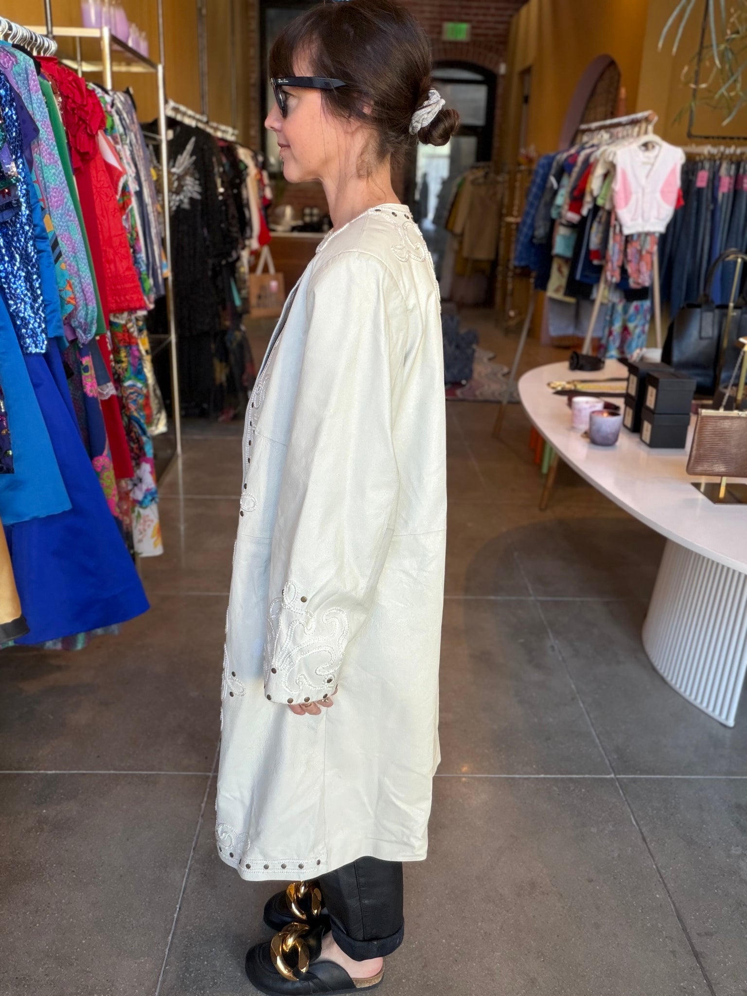 Incredible leather duster with studs and ribbon appliqué. Good condition, normal wear on leather for age, one lighter spot, as pictured. Two hook-eye closures.