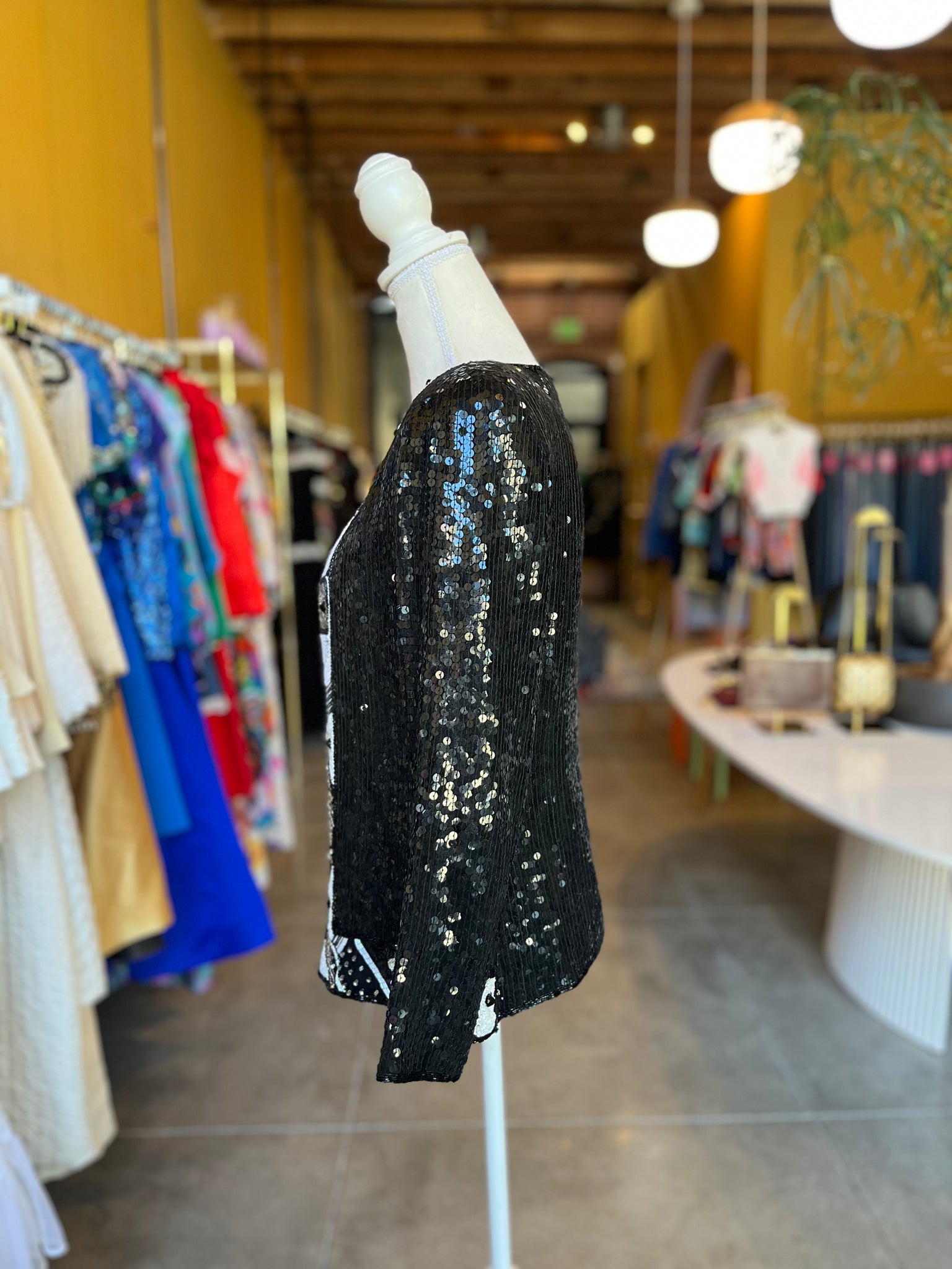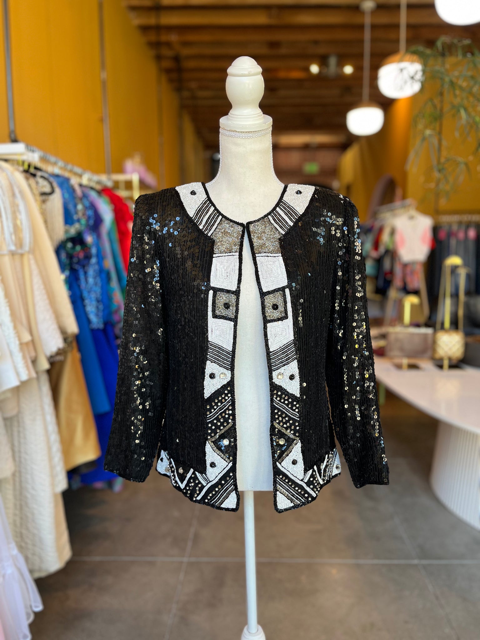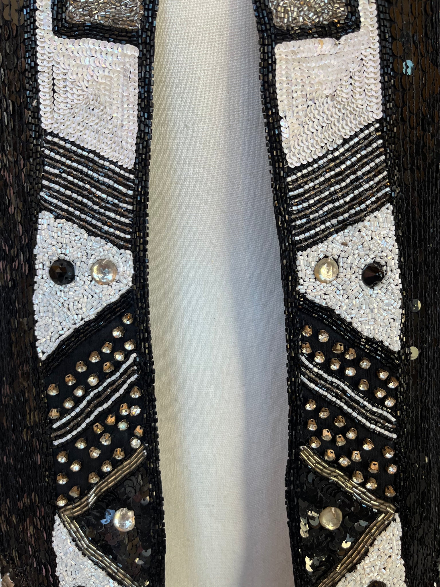 Stunning black and white sequin jacket. Decorative patterns made up of sequins, rhinestones, and glass beads making for the perfect statement piece. In great condition.