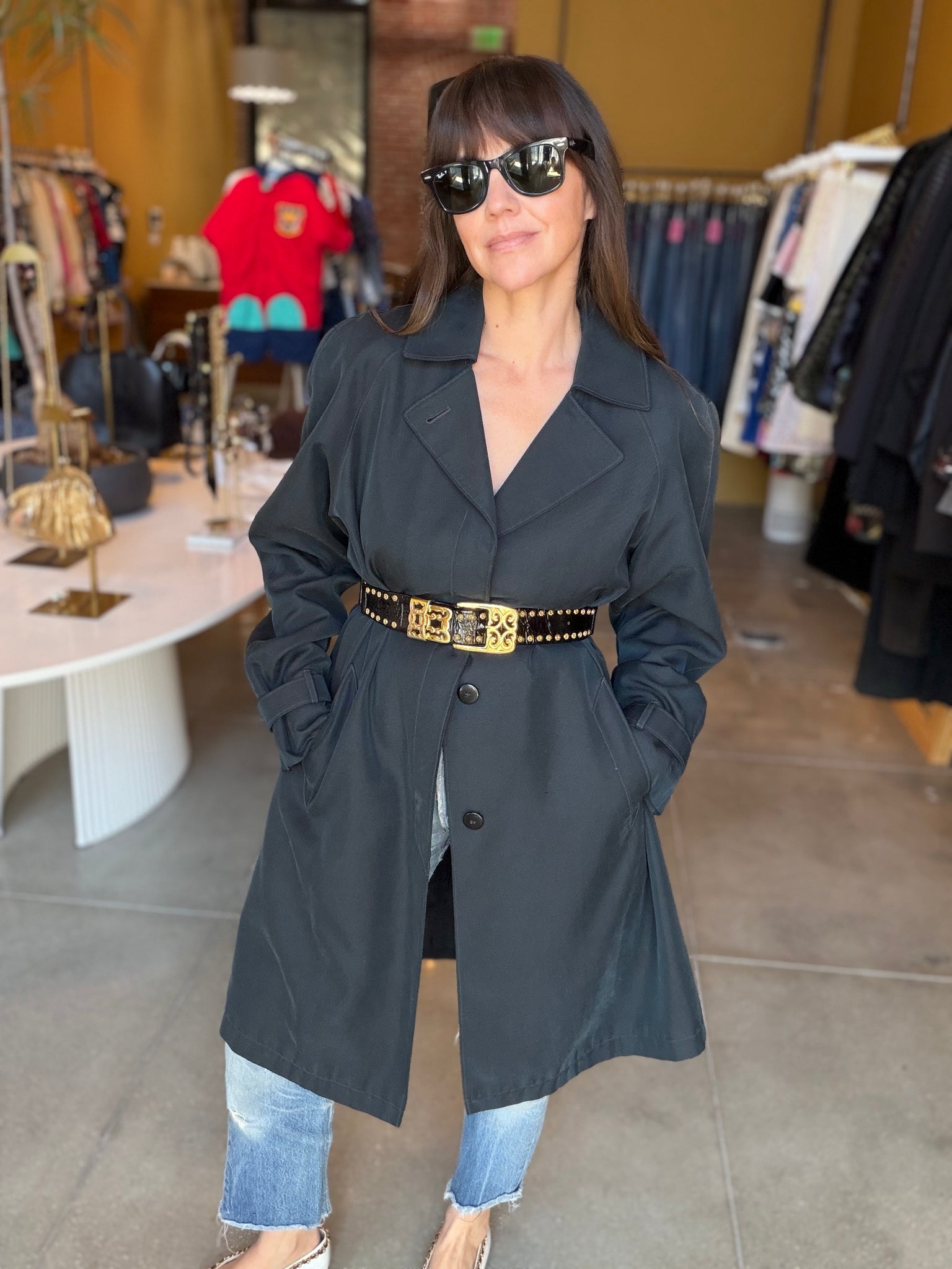 Chíc midnight blue trench, hidden buttons. Great used condition, some wear on end of sleeve, as pictured.