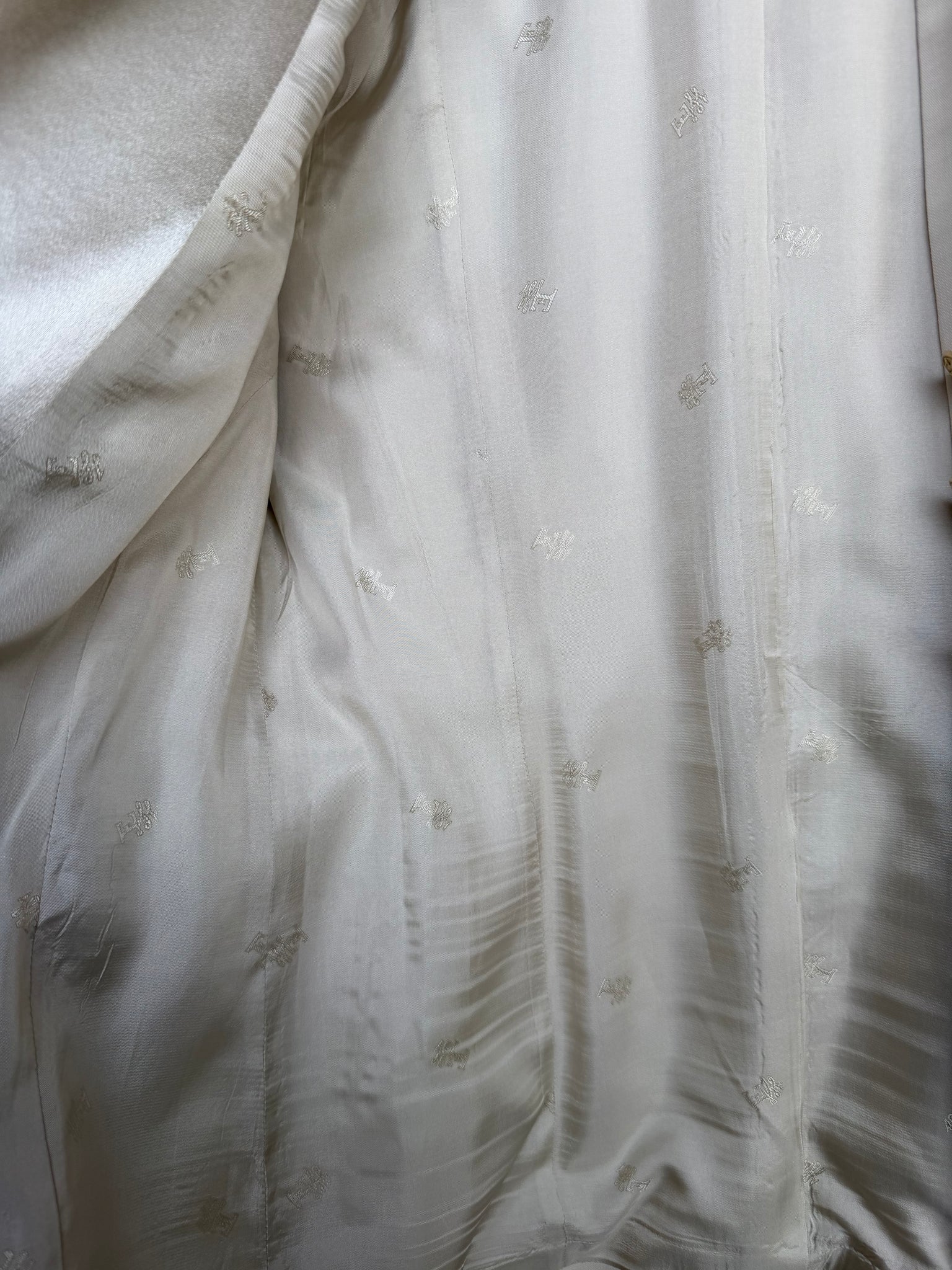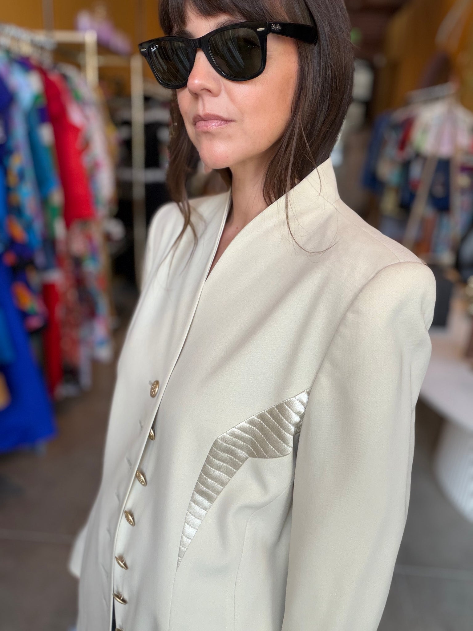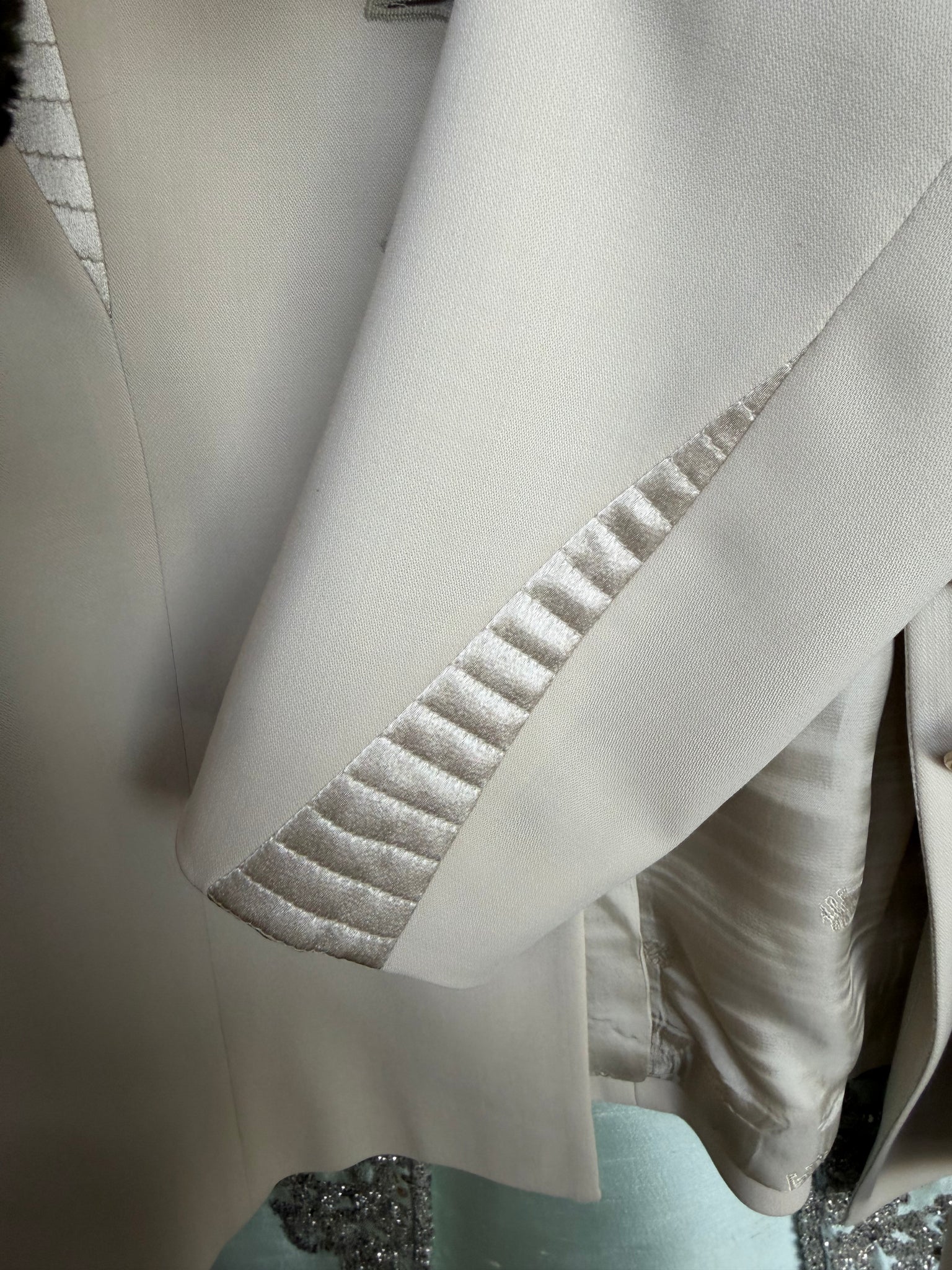 Gorgeous collarless blazer with silk panels on front and on sleeve. Great used condition, one faint pinhead mark, as pictured, not noticeable, has been dry cleaned.