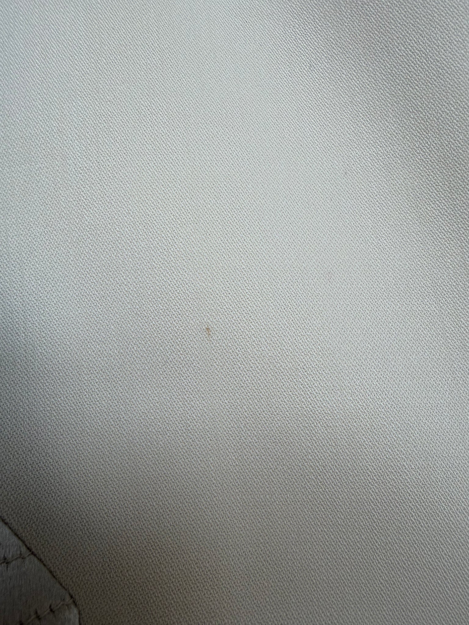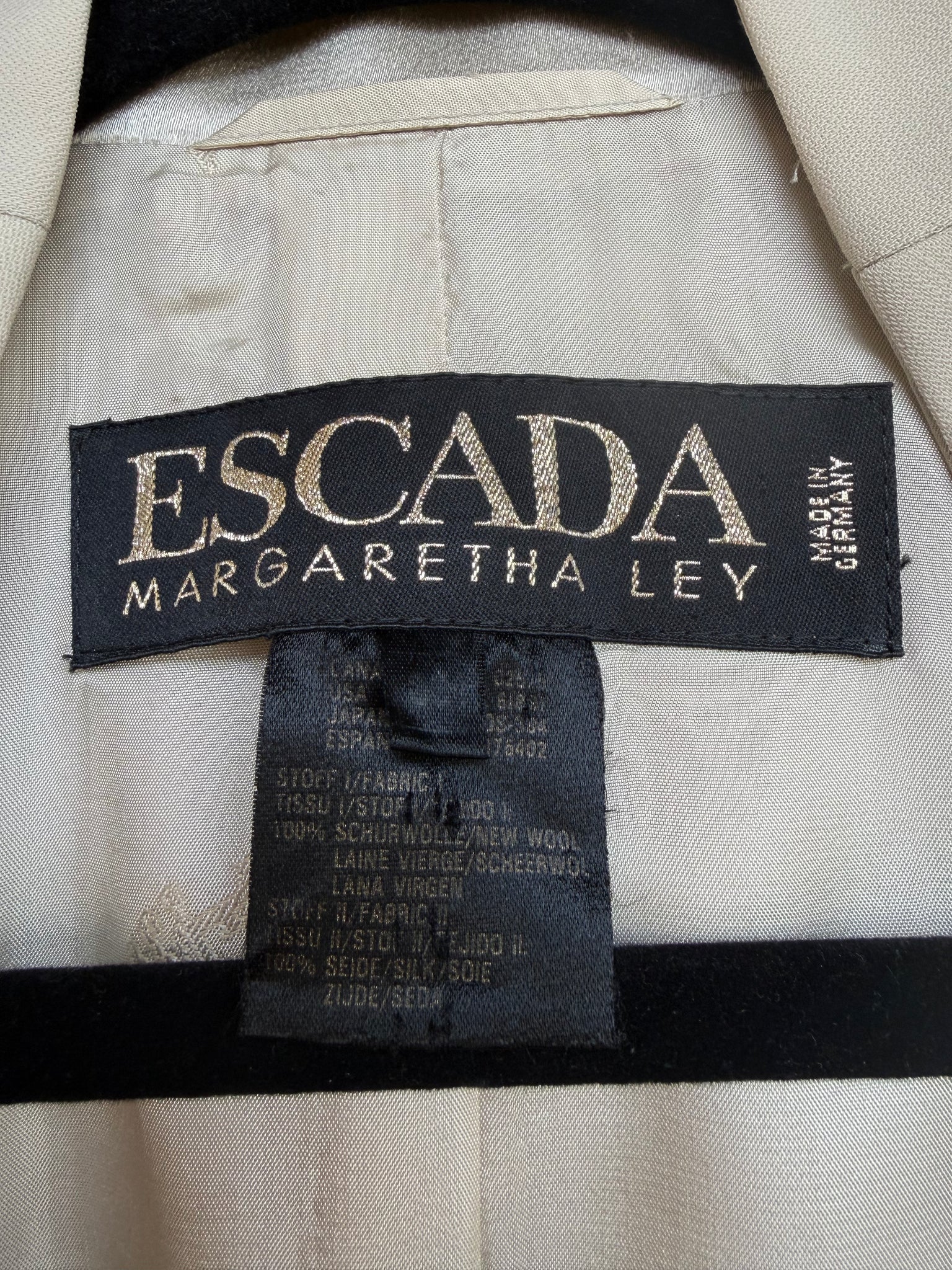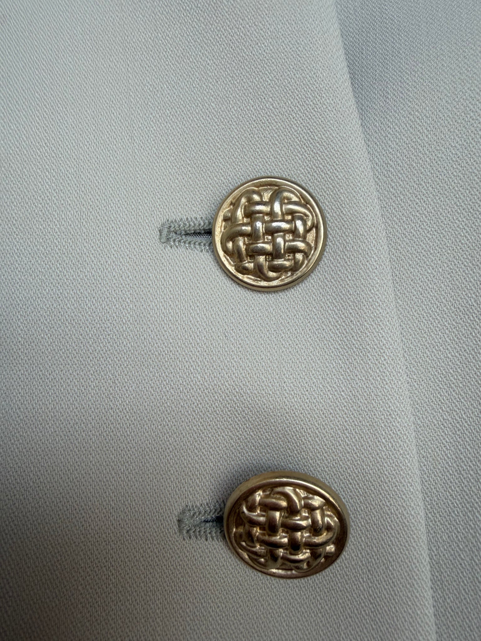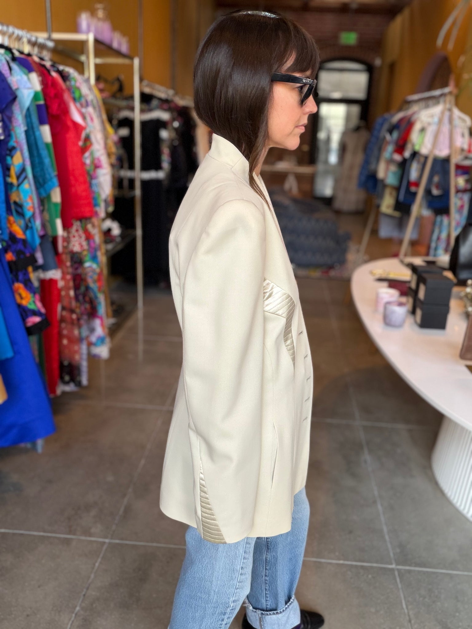 Gorgeous collarless blazer with silk panels on front and on sleeve. Great used condition, one faint pinhead mark, as pictured, not noticeable, has been dry cleaned.