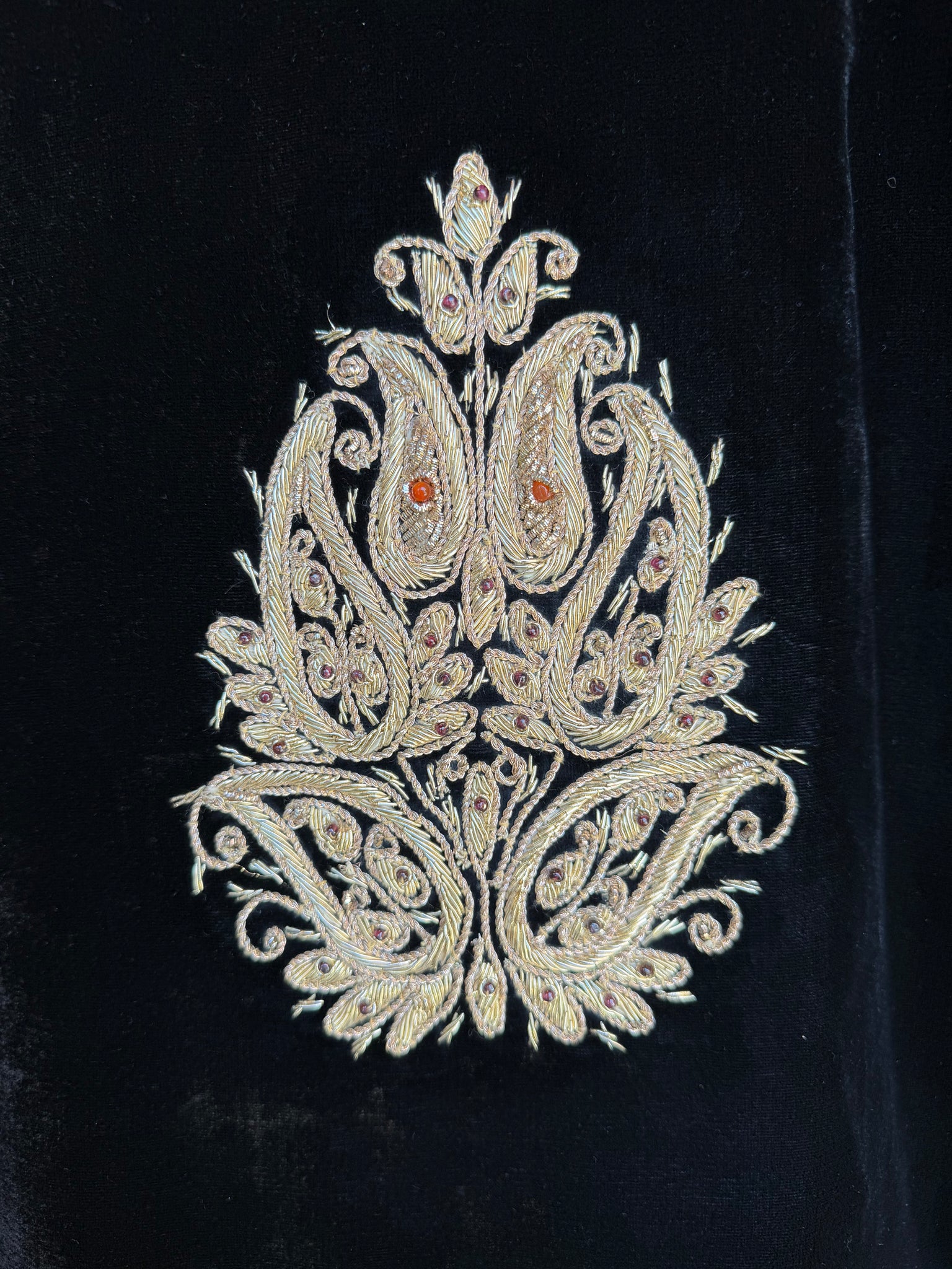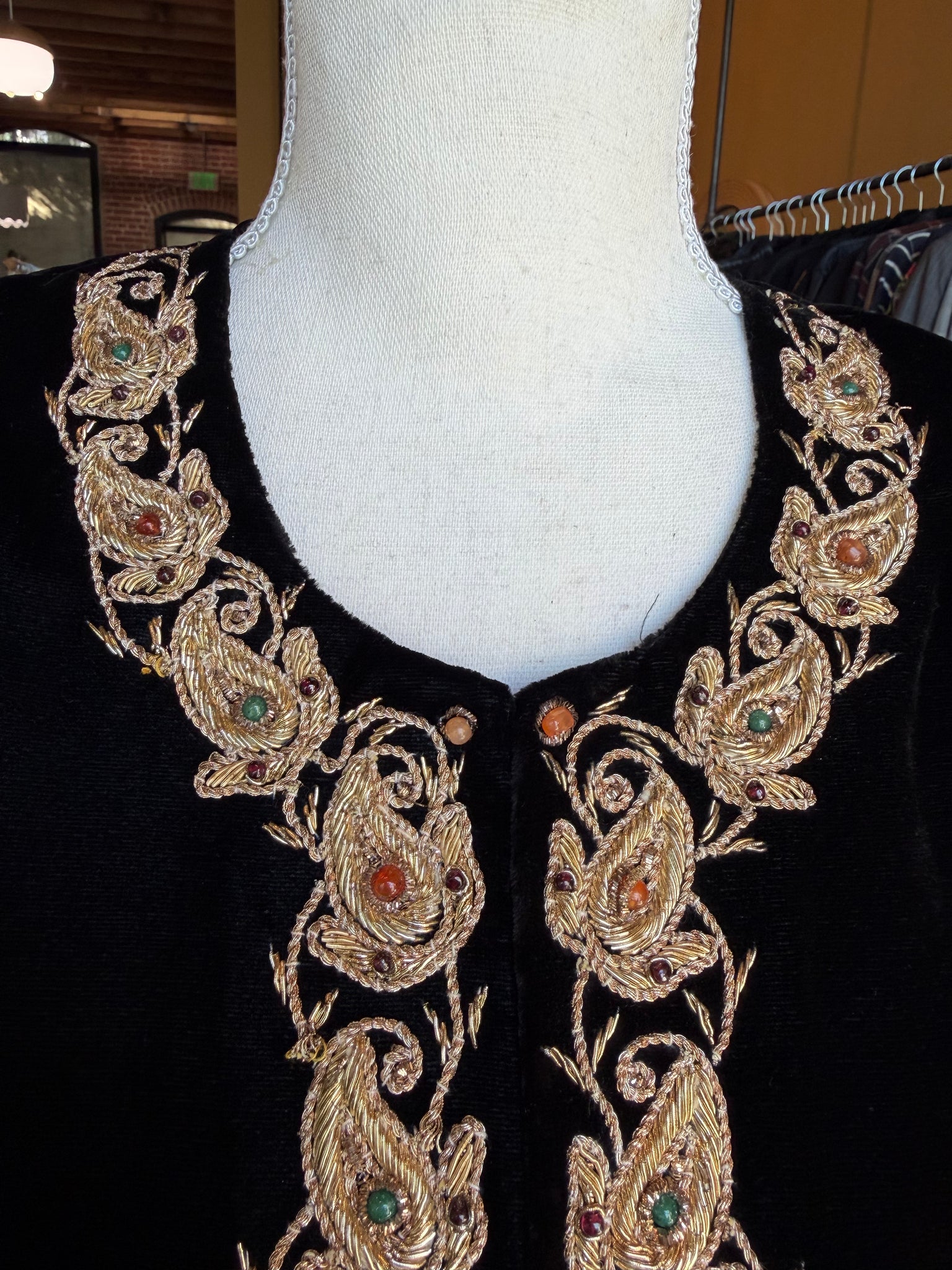 Incredible vintage velvet jacket with gold paisley and bead detail. Excellent used condition, no flaws.